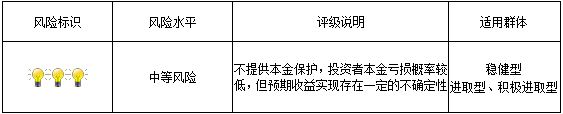 本期产品为非保本浮动收益型理财产品,不保证本金和收益,请您充分认识投资风险,谨慎投资。本期产品期限260天(中国建设银行有权对本期产品进行展期和提前终止),存续期内产品不接受申购或赎回申请。本期产品内部风险评级级别为3盏警示灯 ,风险程度属于中等风险。最不利情况下,资产组合无法回收任何本金和净收益,客户将损失全部本金。产品适合于稳健型、进取型及积极进取型客户。