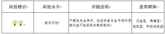 本期产品为非保本浮动收益型理财产品,不保证本金和收益,请您充分认识投资风险,谨慎投资。本期产品期限173天(中国建设银行有权对本期产品进行展期和提前终止),存续期内产品不接受申购或赎回申请。本期产品内部风险评级级别为2盏警示灯 ,风险程度属于较低风险。最不利情况下,资产组合无法回收任何本金和净收益,客户将损失全部本金。产品适合于收益型、稳健型、进取型、积极进取型客户。